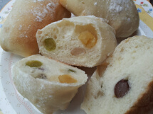 【パン】 オープンクラス 5,6月の今月のパン(リクエスト) [いろいろ豆パン][難易度=中][時間=3時間][3,800円] 豆大福をイメージしたもちもち生地に数種の豆がたっぷり入ったおやつパンです。 |