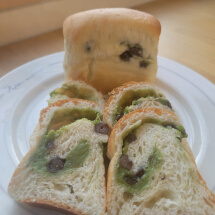 | 【パン】 オープンクラス 1,2月の今月のパン [抹茶と大納言のミニミニ食パン][難易度=中][時間=3時間][3,800円] 1斤型の1/4程度の大きさのミニミニかわいい食パンを4個作ります。 抹茶のクリームと大納言を巻きこんだもっちりパンに仕上げました。 |